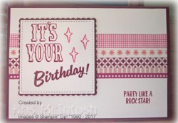 This year Stampin’ Up! decided to do something different with the Washi Tape selections.  Instead of making them specific to a product suite, they have created four Basics Packs of Washi.  Each of the packs is colour related.  Pick a Pattern Washi Tape is a selection of 5 rolls of Washi in a Black and White colour combination.  Basics Pack 1 which is the one I am using today is a pack of 5 pink shades of Washi.  Basics pack 2 is yellow/green in colour and Basics Pack 3 is blue in colour.  This makes it easy to create across all the product suites using these Washi selections.  Anyway for today’s card, I used the Basics Pack 1 and added one of each of the Washi Tape selections in the pack across Whisper White card.   I stamped “party like a rock star” from the Marquee Messages stamp set onto the lower right hand corner using Berry Burst ink before attaching the card to scored and folded Rich Razzleberry card.  I cut a piece of Whisper White card using the largest square in the Stitched Shapes Framelits Dies to create my focal panel.  I stamped “it’s your” from the Marquee Messages stamp set onto the top left hand corner using Berry Burst ink.  I stamped “birthday” from the same stamp set onto the lower right hand corner using Rich Razzleberry ink.  I stamped the three stars, also from the Marquee Messages stamp set onto the top right hand corner using Melon Mambo ink.  The stamped panel is attached to a scalloped square of Rich Razzleberry card which is cut using the Layering Squares Framelits Dies.  The panel is attached to the card front using dimensionals.