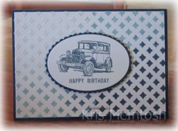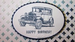 I added one drop of Marina Mist re-inker to the remaining Embossing Paste and added it across the middle of the Whisper White card. I added one drop of Night of Navy ink to the remaining Embossing Paste and covered the remaining Whisper White card. I removed the mask and let the paste dry, which doesn’t take very long. Because I wanted the background to really stand out, I kept the decoration to a minimum. I attached the embossed Whisper White card to scored and folded Night of Navy card. I stamped the car from Guy Greetings onto Whisper White card using Night of Navy ink and stamped the greeting from the Thoughful Banners stamp set underneath using Night of Navy ink.