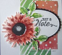 I attached two pieces of the Painted Harvest Designer Series Paper to Very Vanilla card before attaching to scored and folded Early Espresso card. I stamped “just a note” from the Flourishing Phrases stamp set onto Very Vanilla card using Early Espresso ink and cut it out using one of the ovals from the Stitched Shapes Framelits Dies. I attached the greeting to a scalloped oval cut from Early Espresso card using the Layering Ovals Framelits Dies.