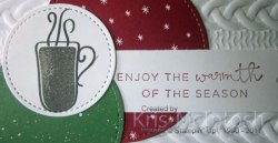The challenge at Match the Sketch this week gave me the opportunity to try out another new stamp set from the Holiday Catalogue – Hug in a Mug.  I am not usually drawn to the “coffee” style stamp set but I liked the idea of this one.  I think it will be great for decorating tags for lots of different presents, not necessarily just at Christmastime.  However, my card today does have a Christmas theme.  I embossed Whisper White card using the Cable Knit Embossing Folder and attached it to scored and folded Cherry Cobbler card.  I cut two different designs from the Be Merry Designer Series Paper using the two largest circles from the Stitched Shapes Framelits Dies.  I attached the largest Circle to the card front.  I stamped the greeting from the Hug in a Mug stamp set onto Whisper White card using Cherry Cobbler ink and punched one end using the Triple Banner PunchI attached the greeting to the card front on top of the designer series paper circle.  I attached the second designer series paper circle so that it partially covered the end of the greeting.  I stamped the coffee mug outline using Early Espresso ink and added the “fill” using Chocolate Chip.  I also added the “steam” image using Early Espresso ink.  The coffee mug is cut out using the second smallest of the circles in the Stitched Shapes Framelits Dies and attached over the circles and the end of the greeting banner.
