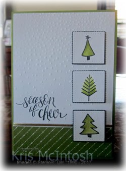 I attached a piece of the Merry Little Christmas Designer Series paper to the bottom of the embossed card. I attached a piece of Gold 1/8″ Ribbon across the top of the Designer Series paper and attached the panel to scored and folded Old Olive card. I stamped the three tree images from the Watercolour Christmas onto Whisper White card using Black Archival ink and cut them out using the smallest square from the Stitched Shapes Framelits Dies.