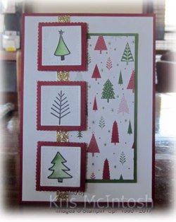 This is the second card I made using Watercolour Christmas.  This one uses the Be Merry Designer Series Paper from the Annual Catalogue.  I attached the Designer Series paper to Garden Green card and then to Whisper White card.  I attached a narrow strip of Gold Glimmer Paper over the left hand edge of the Designer Series Paper panel.  The Whisper White card is attached to scored and folded Cherry Cobbler card.  I stamped the three trees from the Watercolour Christmas stamp set onto Whisper White card using Black Archival ink.  I coloured two of the trees using an Aqua Painter and Garden Green ink.  The images are cut out using the smallest square from the Stitched Shapes Framelits dies.  I attached the images to Cherry Cobbler scalloped squares cut using the Layering Squares Framelits Dies.  The images are attached to the card front over the Gold Glimmer Paper using mini dimensionals.