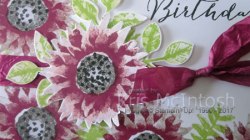I needed to create a birthday card for my friend recently and decided to use a layout I had previously used but with the a different stamp set.  I stamped the flowers from the Painted Harvest stamp set directly onto Whisper White card using Crumb Cake as the base layer and Berry Burst as the top layer.  The centre of the flowers is Chocolate Chip which I stamped off first.  I also stamped the dots into the centre of the flowers using Chocolate Chip ink (without stamping off first).  I stamped the “frilly” leaf image around the flowers using Lemon Lime Twist ink.  I stamped the greeting from the Butterfly Basics stamp set onto the top right hand corner using Chocolate Chip ink.  I wrapped the stamped card with Berry Burst 5/8 “Crinkled Seam Binding and tied a knot before attaching to scored and folded Chocolate Chip card.  I stamped the flower onto scrap Whisper White using Powder Pink as the first layer and Berry Burst as the second layer.  I used Chocolate Chip ink to add the flower centre and some dots before cutting out the flower.  I stamped the solid three petal leaf onto scrap Whisper White card using Lemon Lime Twist ink which I stamped onto scrap paper first.  I stamped the detailed leaf image over the top using Lemon Lime Twist ink once more and punched out three sets of leaves using the matching Leaf Punch.  I attached the leaves to the back of the flower and then to the card front using mini dimensionals.