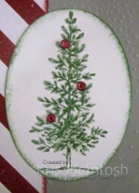 I sponged the edges of a piece of Be Merry Designer Series paper using Cherry Cobbler ink and attached it to the left hand side of the embossed card. I stamped the tree from the Lovely As A Tree stamp set onto Whisper White card using Garden Green ink and cut it out with the largest oval from the Layering Ovals Framelits Dies.