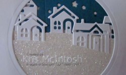 I cut the houses from Whisper White card, also using one of the Hometown Greetings Edgelits Dies. I also cut Dazzling Diamonds Glimmer Paper using the same die. I cut the houses from the Glimmer Paper die cuts and attached the glimmer paper over the Whisper White die cuts. I attached the two die cuts one on top of the other to the Dapper Denim circle.