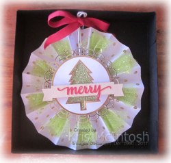Once the scalloped circle was cut the Real Red card was removed from the box lid. We used a 1″ circle punch to punch a finger grip on two opposite sides of the box lid. We also cut the box from the outside edge to the score line on two opposites sides. Once this was done we glued the Designer Series Paper piece to the top of the box. We used Glue Dots to attach a piece of Window Sheet onto the back of the box lid before attaching the Real Red card. Once this was done we assembled the box lid. The base is cut from the outside to the score line on two opposite sides and also assembled. This produced a lovely box which shows off the ornament once it is placed inside. I am pretty sure these are going to make an appearance both on and under my tree this year. If you would like to complete this project, please click on the link below to download your free PDF tutorial here. You will also find this tutorial on my Free Tutorial page.
