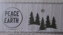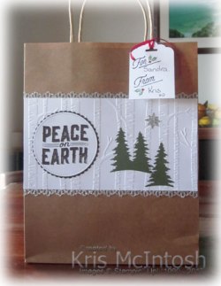 I punched Silver Glimmer Paper with the Decorative Ribbon Border Punch and attached a piece behind the upper and lower edges of the embossed card before attaching to the front of the bag. I stamped Peace on Earth from the Carols of Christmas stamp set onto Whisper White card using Early Espresso ink. I cut the image using the largest Stitched Shapes Framelits Dies and attached the greeting to a Early Espresso scalloped circle cut using the Layering Circles Framelits Dies. The greeting is attached to the left hand side of the embossed Whisper White panel. I cut the tree images from Always Artichoke card using the Card Front Builders Thinlits Dies and attached them to the right hand side of the embossed Whisper White card.