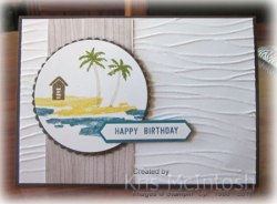 To decorate the inside of the card, I stamped the sand using Daffodil Delight ink onto the lower left hand corner of Whisper White card. The palm tree stems are stamped using Crumb Cake card and the palm leaves using Old Olive ink.