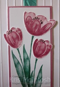 To decorate the inside I stamped the same three stem image from the Tranquil Tulips stamp set onto the lower left hand corner of Whisper White card using Emerald Envy ink. I added a few leaves around the base of the stems also using Emerald Envy ink. I stamped the flower (also a two step stamp) onto the flower stems using Sweet Sugarplum ink. I decided not to add a greeting to this card because I think it could be used for a few different occasions.