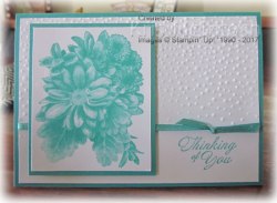 Anyway, onto my cards – for the first card I embossed the top two-thirds of Whisper White card using the Softly Falling Embossing Folder. I stamped the greeting from the Heartfelt Blooms stamp set onto the lower right hand corner of the embossed card using Bermuda Bay ink.