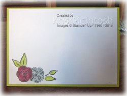 Since I have been playing with this stamp set for a couple of days now, I had several images which I had already stamped laying on my desk.  The images were coloured using an Aqua Painter and Berry Burst, Lemon Lime Twist and Soft Sky ink.  I cut out the single flower and attached it to the lower left hand corner of Whisper White card.  I stamped the leaf image onto the flower using Basic Black Archival ink and coloured the leaves using an Aqua Painter and Lemon Lime Twist ink.  I cut out the second flower with the leaves and attached it to the Whisper White card, partially covering the Soft Sky flower.