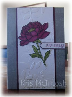 I saw the sketch challenge at Freshly Made but unfortunately not in time to submit my entry.  However, I think it is a pretty card, which I thought you would like to see.  I stamped the background stamp from the You’ve Got This stamp set onto scored and folded Smoky Slate card using Smoky Slate ink.  I embossed Whisper White card using the Layered Leaves Embossing Folder, attached it to Rich Razzleberry card and then the card front.  I stamped the flower from the You’ve Got This stamp set onto Whisper White card using Memento Tuxedo Black ink.  The image is coloured using the Rich Razzleberry, Old Olive and Daffodil Delight Stampin’ BlendsI cut out the flower and leaves and attached it to the embossed card.  I stamped “happy birthday” from the Picture Perfect Birthday stamp set onto Whisper White card using Rich Razzleberry ink.  I punched out the greeting using the Classic Label Punch.  I attached the punched greeting to a narrow strip of Rich Razzleberry card and trimmed the left hand end to made the punch.  The greeting is attached to the card front and the right hand edge is trimmed to match the edge of the card.