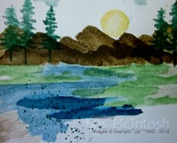 Today’s card uses the Waterfront stamp set and once more we are following the Jackie Bolhuis’ video with the quick watercolour technique. This card follows a similar layout to yesterday’s card but this time each of the stamps is applied and then an Aqua Painter is used to colour each image within the outlines of the stamp. So the mountains are stamped in Soft Suede onto Shimmer White card and then the Aqua Painter is used to move the colour around within the outline of the stamp. The mountains are stamped again but this time stamped off onto scrap paper first to give a slightly lighter colour. The grass is stamped using Garden Green ink and there is also some ground stamped using Crumb Cake ink.