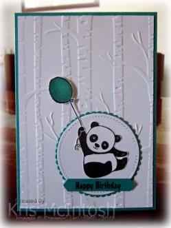 My great nephew turned 1 recently and this gave me the opportunity to play with the Party Pandas stamp set which is one of the sets you can earn for free during Sale-A-Bration.  I was actually a little late getting his birthday gift together but hopefully he will forgive me.  I  embossed Whisper White card using the Woodlands Embossing Folder and attached it to scored and folded Bermuda Bay card.  I cut Whisper White card using one of the circles from the Stitched Shapes Framelits Dies and also a scalloped circle from Bermuda Bay card using one of the scalloped circles from the Layering Circles Dies The pieces are attached together and then to the lower right hand corner of the card front.  I stamped the panda from the Party Pandas stamp set onto scrap Whisper White card using Memento Tuxedo Black ink and coloured the balloon using the Bermuda Bay Stampin’ Blends I cut out the panda and attached the Panda to the stitched circle, I added a dimensional to the back of the balloon so that it would sit properly on the card front.  I stamped “happy birthday” from the Party Pandas stamp set onto Bermuda Bay card using Memento Tuxedo Black ink and punched out the greeting using the Classic Label Punch.  The greeting is attached below the panda.