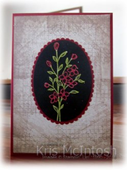 This is an old technique which someone shared on a demonstrator facebook page I belong to.  So, of course, I had to give it a try with some of my current stamps.  For this card I created a background using the Timeless Textures stampset.  I stamped three of the images from the stamp set onto Very Vanilla card using Crumb Cake ink.  Once I had finished stamping, I sponged around the edges using the same ink.  I attached the Very Vanilla card to scored and folded Cherry Cobbler card.   I stamped the image from the Touches of Texture stamp set onto Basic Black card using Versamark ink.  I covered the image with White Embossing Powder and heat set it.  Then I used my Cherry Cobbler and Old Olive Stampin’ Blends to colour the image.  I cut the image out using one of the Layering Ovals Framelits dies and attached it to a Cherry Cobbler scalloped oval cut using the same dies.  I attached the image panel to the centre of the stamped Very Vanilla card.