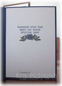To decorate the inside of the card, I stamped the greeting from the Perennial Birthday stamp set onto Very Vanilla card using Night of Navy ink.  I stamped the image from the Lots of Lavender stamp set using Memento Tuxedo Black ink.  I stamped the fill images using Night of Navy and Old Olive ink.