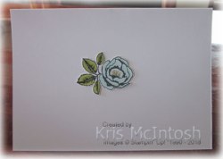 I attached the two leaves to the back of the flower before attaching to the centre of the Whisper White square. To decorate the inside, I once more stamped, coloured and cut out the small flower.