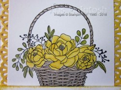 I loved yesterday’s card and I love today’s card. When I had finished creating, I thought I would like to create the same card with just a little more dimension, so this time I stamped, coloured and cut out the central flower which is attached over the one in the basket using mini dimensionals. I also added two small and one medium Basic Rhinestone to the centres of the flowers.