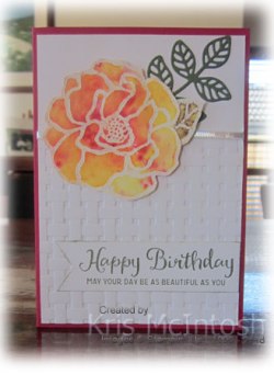 Here is another card we will be making at my March classes. For this card, I embossed the lower two-thirds of Whisper White card using the Basket Weave Embossing Folder (boy is this folder gorgeous and it’s free with a qualifying order during Sale-A-Bration). I wrapped the top of the embossing with Silver 1/8″ Ribbon and attached the embossed panel to scored and folded Real Red card. I stamped the greeting from the Beautiful Day stamp set onto Whisper White card using Always Artichoke ink , punched one short end with the Triple Banner Punch , sponged the edges with Always Artichoke ink and attached the greeting to the card front. I cut Always Artichoke card using one of the dies from the Flourish Thinlits Dies. I attached the Always Artichoke leaf to the top right hand corner of the card front. I stamped the flower from the Beautiful Day stamp set onto Shimmery White card using Versamark ink, sprinkled it with White Embossing Powder and heat set it. I used my Aqua Painter to add water to the inside of the embossing.