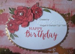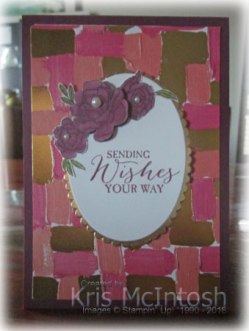 I have used Calypso Coral and Rich Razzleberry card bases and the two scalloped ovals were cut from Gold Foil. For the cards with the ovals, I trimmed away the basket and just used the flowers to accent my greetings – “happy birthday” from the Rose Wonder stamp set and “sending wishes you way” from the Butterfly Basics stamp set. The last card uses the full image. For some extra dimension, I stamped, coloured and cut one additional large flower for each card which is attached with a dimensional.