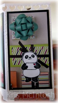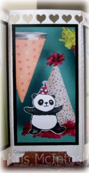 I punched one short end using the Triple Banner Punch and lightly sponged around the edges using Melon mambo ink before attaching to the first panel. I stamped the Panda with the balloons from the Party Pandas stamp set onto Whisper White card using Memento Tuxedo Black ink and cut it out.
