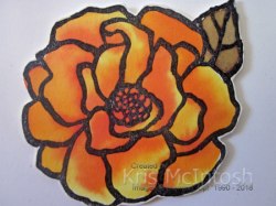 This time to colour the image, I used the Aqua Painter to add ink inside the embossed image. You need to make the water pool inside the embossing, so that it stays fairly wet. I used Yellow, Gamboge and Brilliant Red Brusho Crystals to colour the image by adding each colour to a clear block and mixing the crystals with the Aqua painter. I used the Aqua Painter to lift the colour and dab it into the water (first yellow, then Gamgoge and then Brilliant Red). The ink spreads inside the embossed image and colours the water. This method lets the colour spread where it wants and creates a one of a kind image. The leaves are coloured in the same manner using the Moss Green Brusho. I waited until the image was dry and then cut it out and attached it to the card front using dimensionals.