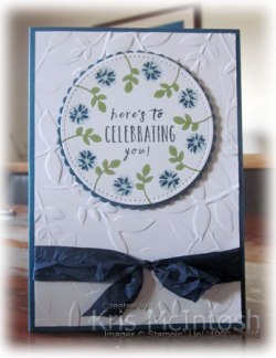 I embossed Whisper White card using the Layering Leaves Embossing Folder and wrapped it with a length of Dapper Denim 5/8″ Crinkled Seam Binding which I tied in a knot. The embossed card is attached to scored and folded Dapper Denim card.