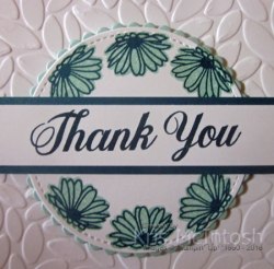 While I was playing with the Stamparatus and creating wreaths, I thought I would try something slightly different.  I embossed Whisper White card using the Petal Burst Embossing Folder and attached it to scored and folded Pool Party card.  I used the template I created following Ruth’s video instructions.  This time I used the Daisy Delight stamp set.  I stamped the solid flower using Pool Party ink but instead of stamping the whole 8 images, I stamped three, missed one and then stamped another three.  The detailed flower is stamped over the solid flowers using Dapper Denim ink.  I cut the image using a circle from the Stitched Shapes Framelits Dies and attached it to a Pool Party scalloped circle cut usng the Layering Circle Framelits Dies.  The panel is attached to the card front using dimensionals.  I stamped “thank you” from the Daisy Delight stamp set onto Whisper White card using Dapper Denim ink.  I punched each end of the Whisper White card using the Triple Banner Punch.  The banner is attached to Dapper Denim card and the ends trimmed to match the Whisper White banner.  The greeting is attached to the card front using dimensionals under each end.