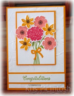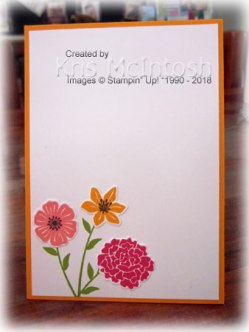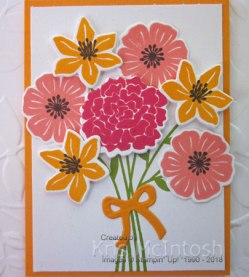 I stamped three different flowers using three different inks – Mango Melody, Flirty Flamingo and Melon Mambo. The flower centres are stamped using Early Espresso ink. Each of the flowers are cut out using the matching Bouquet Bunch Framelits Dies. The Flirty Flamingo Flowers are attached flat onto the Whisper White card and all of the other flowers are attached using Mini Dimensionals. I cut the bow from Mango Melody card and attached it over the flower stem. The image panel is attached to Mango Melody card and then the card front using dimensionals.