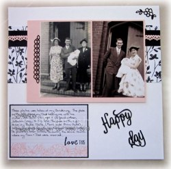 A4 card is slightly short of 12″, so I cut it and left a gap in the middle when I attached it to the Designer Series Paper. I cut the decorative piece from Basic Black card using the Petals and More Thinlits Dies and attached it behind the photo on the left. The two photos are attached to Powder Pink card and then attached over the Designer Series Paper. I attached one of the Petal Passion Memories and More cards to Basic Black card and attached it to the lower left hand corner of the page. I cut “Happy Birthday” from Basic Black card using the Birthday Thinlits Die and cut the pieces apart to create Happy Day for my title. I cut the flower die from Basic Black card using the Petals and More Thinlits Dies and attached it to the top right hand corner. This time my journalling is hand written. I read somewhere that you should use your handwriting to preserve it for future generations (not sure mine is worth preserving but..).