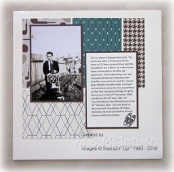 Since I was on a mission to use up the True Gentleman Designer Series Paper that I still had left, and while I was making the cards I shared yesterday, I decided to use some of it on my Memory Keeping page. I had already cut the paper into card front pieces so I just attached them to a Very Vanilla 12″ x 12″ page in a grid fashion. I attached the photo of my Grandfather to Chocolate Chip card before attaching over the Designer Series Paper. I created my journalling on my computer and printed it onto Very Vanilla card.
