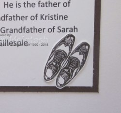 I attached the journalling to Chocolate Chip card and attached it over the Designer Series paper. I stamped the shoes from the Guy Greetings stamp set onto scrap Very Vanilla card using Chocolate Chip ink and cut them out before attaching to the journalling panel. I remember my Grandfather wearing shoes just like that!