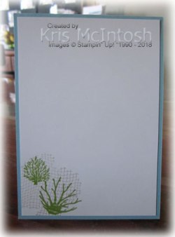 To decorate the inside of the card, I stamped the “fishing net” image onto the lower left hand corner of Whisper White card using Crumb Cake ink. I stamped one small and one large “seaweed” image over the top using Granny Apple Green ink.