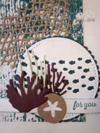 To decorate the inside of the card, I stamped the long border image using Crumb Cake ink to represent sand. Next I stamped the long seaweed stamp from the Sea of Textures stamp set using Tranquil Tide ink onto the lower left hand corner of Whisper White card. I stamped another of the seaweed images using Fresh Fig ink over the top and lastly added the “starfish” which came from the centre of the sand dollar.