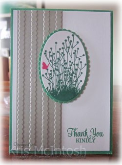 I embossed a piece of Gray Granite card using the Striped Scallops Embossing Folder before attaching it to the stamped card. I attached the whole panel to scored and folded Call Me Clover card. I stamped the long grass image and the tall floral image from the Enjoy Life stamp set onto Whisper White card using Call Me Clover ink and added one of the small butterflies from the same stamp set using Melon Mambo ink.