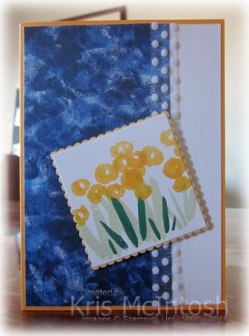The panel is attached to scored and folded Mango Melody card. I stamped the stem images from the Abstract Impressions stamp set firstly using Soft Sea Foam ink and then the second image using Shaded Spruce ink. I stamped the solid flower heads using Mango Melody ink and stamped the detailed flower head image over the top using the same ink.