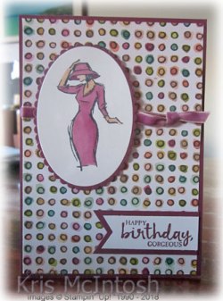 The banner is attached to the lower right hand corner of the card front. I stamped the focal image from the Beautiful You stamp set onto Whisper White card using Memento Tuxedo Black ink. I coloured the image using the Rich Razzleberry and Ivory Stampin’ Blends.