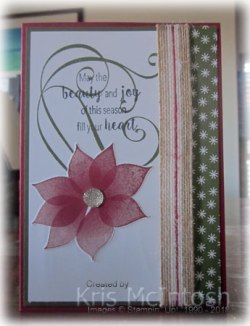 I wrapped the edge of the Designer Series Paper with 5/8″ Striped Burlap Ribbon (another one from the Holiday Catalogue). The whole panel is attached to scored and folded Cherry Cobbler card. I stamped the poinsettia image from the Stylish Christmas stamp set onto scrap Whisper White card using Cherry Cobbler ink and cut it out. I attached the image to the card front and added Clear Faceted Gem to the centre.