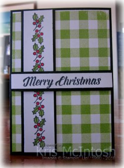 I saw a card on Pinterest that used the holly image from the Blended Seasons stamp set in a panel across the top of a card and it gave me an idea to try using the Peaceful Poinsettia stamp set and the Buffalo Check background stamp.  I stamped the Buffalo Check background onto Whisper White card using Granny Apple Green ink and attached it to scored and folded Basic Black card.  I stamped the holly image from the Peaceful Poinsettia stamp set twice onto a strip of Whisper White card, once at the top and once at the bottom.  I coloured the image using the Dark Real Red and Dark Granny Apple Green Stampin’ Blends.  I attached the stamped panel to Basic Black card and attached it to the left hand side of the card front.  I stamped the greeting from the Timeless Tidings stamp set onto Whisper White card using Memento Tuxedo Black ink I attached the greeting to Basic Black card and then the card front using dimensionals.