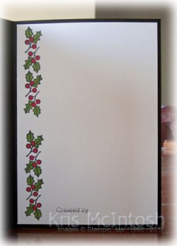 To decorate the inside of the card, I stamped the holly image from the Peaceful Poinsettia stamp set twice onto the left hand side of Whisper White card, once at the top and once at the bottom.  The images are coloured using the Dark Real Red and Dark Granny Apple Green Stampin’ Blends.