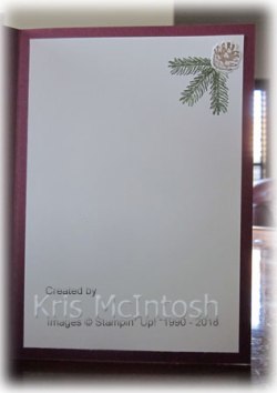 I stamped the pine cone onto Very Vanilla card using Soft Suede ink and cut it out using the co-ordinating In The Woods Framelits Die. The pinecone and leaves are attached to the stamped wreath. I cut a bow from Merry Merlot card using the die from the Bouquet Bunch Framelits. The bow is attached over the leaves and pine cone.