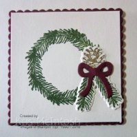 This card is loosely based on another of the cards in the Holiday Catalogue using the Winter Woods stamp sets. I stamped the greeting from the Winter Woods stamp set onto Very Vanilla card using Merry Merlot ink. The stamped panel is attached to Mossy Meadow card and then scored and folded Merry Merlot card. I used the Stamparatas and small leaf image in the Winter Woods stamp set to create a wreath on Very Vanilla card using Mossy Meadow ink. I cut out the wreath panel using one of the dies in the Layering Squares Framelits Dies and attached it to a Merry Merlot scalloped square cut using the same dies.