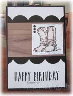 Today’s card was inspired by the sketch challenge at Try Stamping on Tuesday. I started by stamping “Happy Birthday” from the Perennial Birthday stamp set onto the bottom of Whisper White card using Early Espresso ink. I cut two scalloped pieces from Early Espresso card using the die from the Seasonal Layers Thinlits Dies. The scallop edges are attached behind the long edges of a piece of Wood Textures Designer Series Paper before being attached to the stamped Whisper White card. The whole panel is attached to scored and folded Early Espresso card. I stamped the boot image from the Country Livin’ stamp set onto Whisper White card using Early Espresso ink.