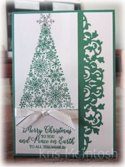 Remember this card I shared with you recently. Well we made the card recently at my Beachmere Classes and I had a few kits left over. So with the Snowflake Showcase products sitting on my desk, I decided to re-create the cards using these new products. For the first card the tree image and the greeting from the Snow is Glistening stamp set are stamped on to Whisper White card using Call Me Clover ink. I wrapped a piece of Silver 3/8″Metallic Edge Ribbon between the tree and the greeting and tied a knot. I cut Call Me Clover card using one of the Delicate Lace Edgelits Dies and attached it behind the right hand edge of the stamped card before attaching to Whisper White card and then scored and folded Call Me Clover card.