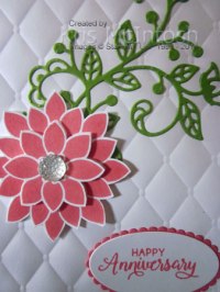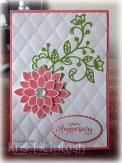 ….to my eldest daughter Sarah and Son-in-Law Sean who celebrated their 18th Wedding Anniversary yesterday. Of course I had to make them a card! I embossed Whisper White card using the Tufted Dynamic Embossing Folder and attached it to scored and folded Flirty Flamingo card. I cut the large flourish from Granny Apple Green card using the Flourish Thinlit Dies. The flourish is attached to the top right hand side of the embossed card. I stamped the flower from the Flourishing Phrases stamp set onto Whisper White card twice using Flirty Flamingo ink.