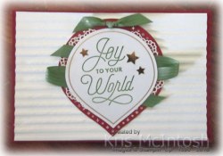 I had quite a few Sincerely Santa Tag kits left over from my recent classes and I thought that I would try and upscale them for another use. Soooo, I used some of the tags to create pocket pages for my Christmas Memory Keeping. For the first tag – Joy to the World, I created the tag pretty much according to the kit, however, I used a piece of the Garden Green Satin Ribbon and tied a knot and added it where the string to hang the tag would normally go.