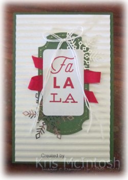 The second tag is the “Fa La La” tag which I created using the pieces which came in the kit, except this time, I used two of the pieces of White Twine and tied a bow which I attached where the string would normally be to hang the tag. Once more the tag is attached to Whisper White card which is embossed using the Corrugated Dynamic Embossing Folder and then Garden Green card. Again this creates a 6″ x 4″ card for my Memory Keeping.