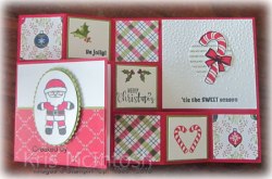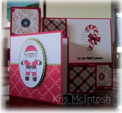 This card is made for Elyssa and Jae and uses the same template which you can find in the Fancy Fold card on my Free Tutorials page. I cut the base from Real Red card and added four small pieces of Under the Mistletoe Designer Series Paper. I stamped the double candy cane image from the Candy Cane Season stamp set onto Whisper White card using Real Red ink and attached it to Old Olive card and then the card base. I stamped the leaf image from the same stamp set onto Whisper White card using Old Olive ink, add the berries using Real Red ink and stamped the greeting using Memento Tuxedo Black ink. This panel is also attached to Old Olive card and then the card base.