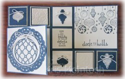 I made this card for each of my daughters using the template that you can find in the Fancy Fold card on my Free Tutorials page.  I cut the card base from Night of Navy card using the aforementioned template.  The large panel on the right is stamped using the multiple bauble image from the Beautiful Baubles stamp set and Night of Navy ink.  I stamped the greeting from the same stamp set below the baubles using the same ink before attaching the panel to the card base.  I attached Night of Navy card to Silver Glimmer paper and attached the panels to the top left and bottom right of the card base.  I stamped the same multiple bauble image onto Whisper White card using Night of Navy ink and used the co-ordinating Detailed Baubles Thinlits Die to cut out the image.  I attached one bauble to each of the Night of Navy squares.  I embossed Whisper White card using the Tin Tile Dynamic Embossing Folder and then cut out two of the “tiles”.  These are attached to Night of Navy card and Whisper White card before being attached to the card base.  I attached two Whisper White panels to the card base, one in the centre of the top of the card and one in the centre of the bottom of the card.  I cut Night of Navy card using the  Detailed Baubles Thinlits Die and attached one bauble to each of the panels.  I stamped the greeting from the Beautiful Bauble stamp set onto Whisper White card and attached it to the centre panel of the card base.  To decorate the front of the small card, I cut the large “doily” from Night of Navy card using the Detailed Baubles Thinlits Dies.  The die is attached to Whisper White card and then the card front.  I cut the bauble image from Night of Navy card using the same dies and attached it to the centre of the “doily”.   To decorate the inside of the card, I stamped a small part of the bauble image onto the top left hand corner using Night of Navy ink.  Lastly I tied bows in Silver Bakers Twine and attached the bows to each of the baubles.