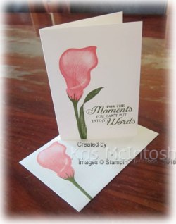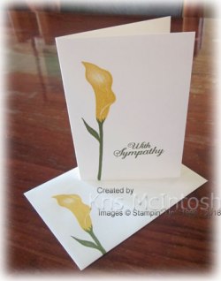 Today’s cards again focus on simple or beginner stamping. I have used the Lasting Lilly stamp set which is one that you can earn FREE during Sale-A-Bration. The card bases are once more note cards. I have stamped the leaf images using Old Olive ink and the small flower using Daffodil Delight ink and the larger flower using Flirty Flamingo ink. The greetings which are also from the Lasting Lilly stamp set are stamped using Old Olive ink. These images are Distinktive which means that you need to add your ink carefully so that it is not overloaded.